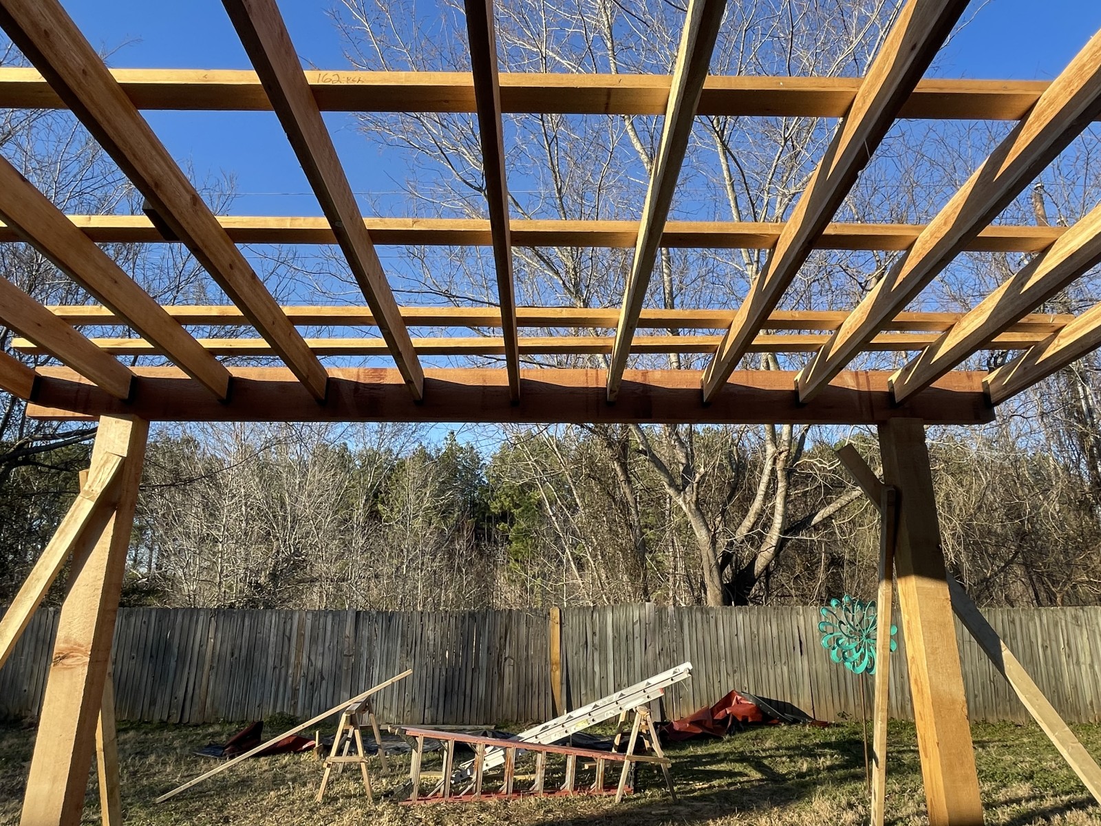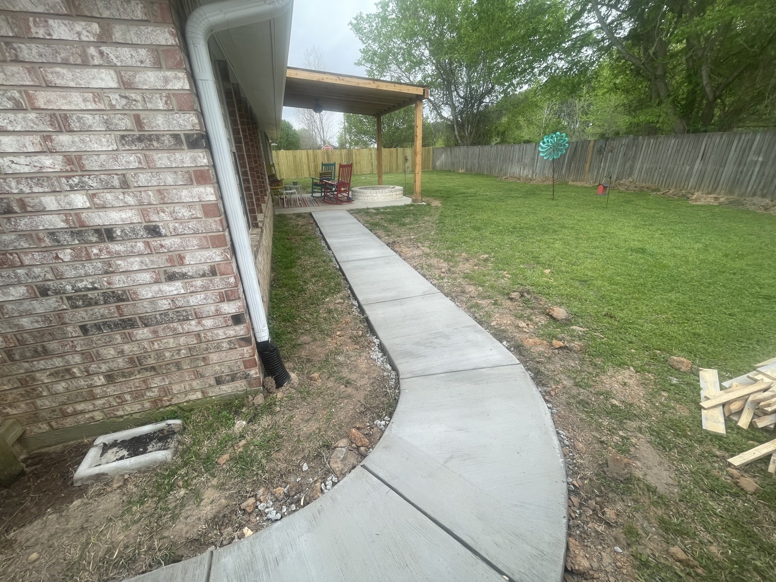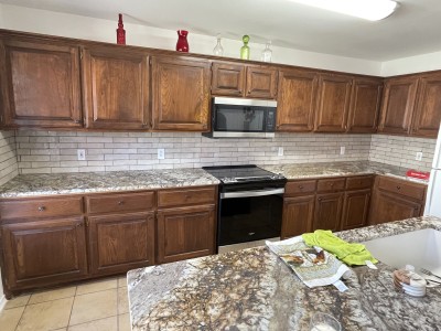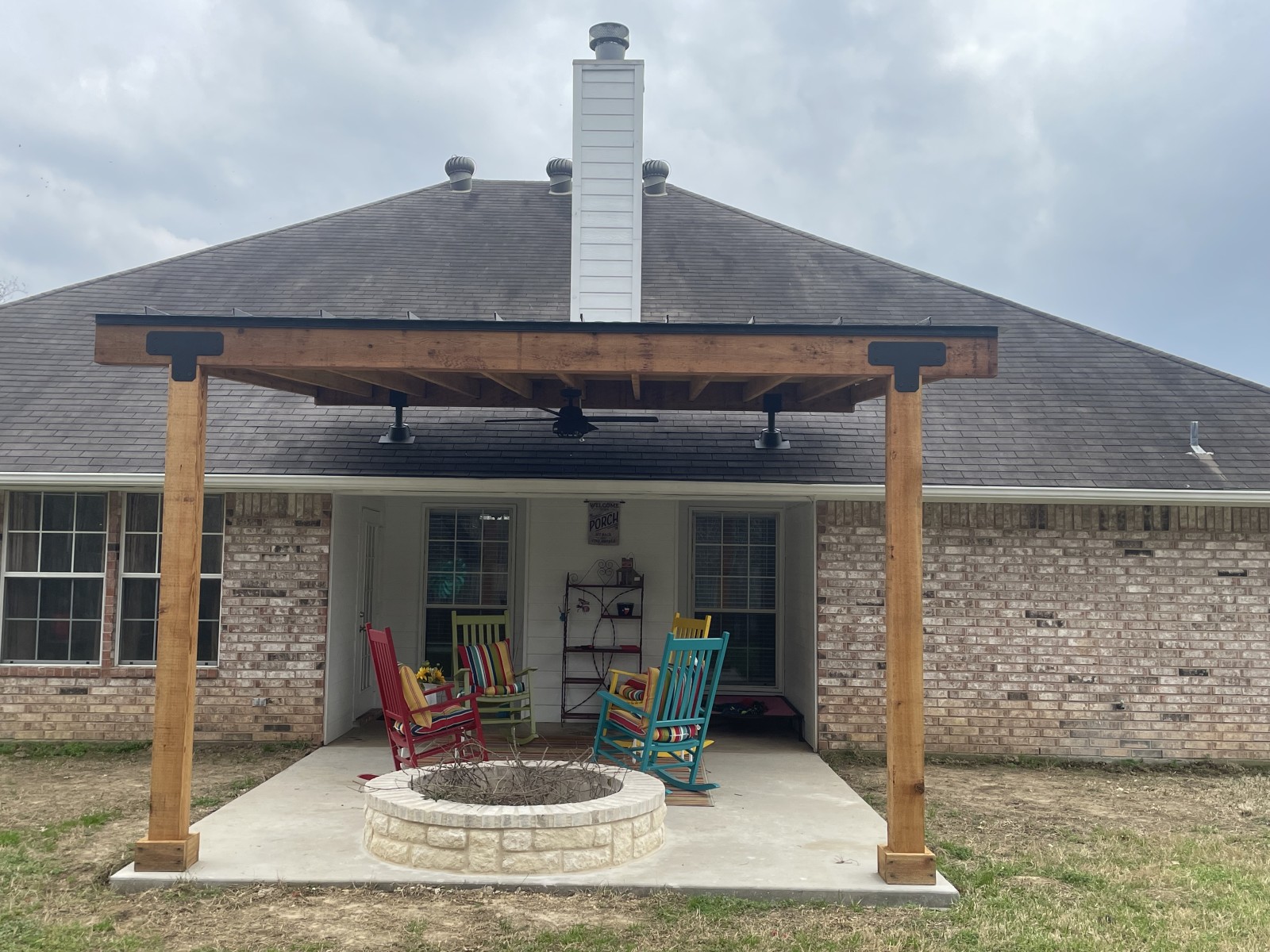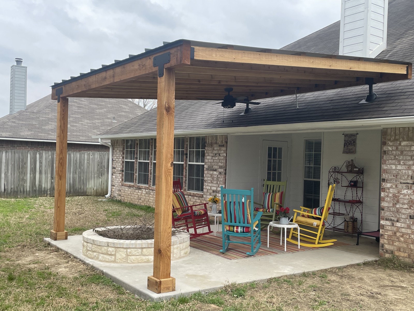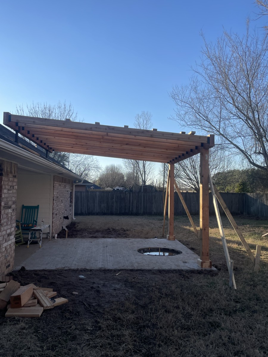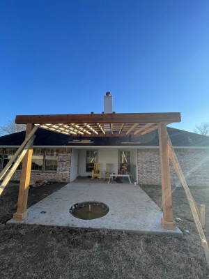 This project started with building a 12 x 14 cedar pergola with a fire pit. We put a black metal roof on top and matched all the necessary hardware like the two risers, t brackets, joist holders etc, We also replaced her countertops with granite and installed new backsplash, Currently we are working on updating the exterior of the house with a 8x8 cedar post replacing an old column post, and were painting the entire home using Shoji white by sherwin williams . More updates and pictures to come in the near future!